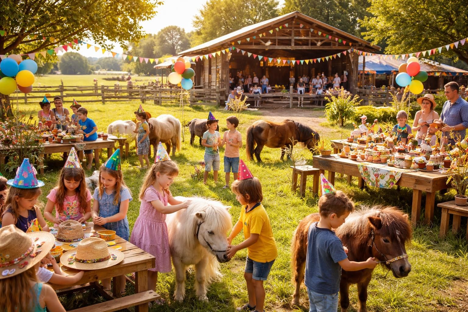 Il est courant d’installer des ballons aux couleurs du ranch ou des guirlandes réalisées avec des images de poneys. Ces éléments visuels renforcent le thème tout en ajoutant une touche festive à l’événement. Des nappes à motifs équestres ou des assiettes décorées complètent le décor, rendant chaque coin du ranch coloré et joyeux.